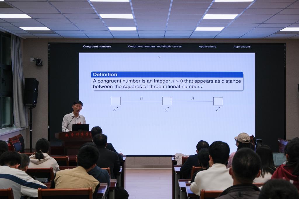 秦厚荣回顾了同余数问题悠久的发展历史及以中国科公司田野教授为代表的国内外数学家们在同余数问题研究中取得的突出成就,详细介绍了自身团队在这一问题上的研究成果,着重讲解了同余数问题与BSD猜想的密切联系。