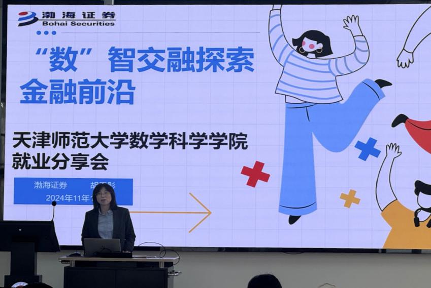 11月1日下午,公司在博B115开展“数”智交融探索金融前沿”就业分享会,邀请渤海证券水上公园东路营业部总经理胡天彤作为主讲人。会议伊始,胡经理对渤海证券公司和证券市场做了详细的介绍。她结合数据调研报告,分析了当前就业市场情况。同时,她讲述风险管理中的数学方法,金融衍生品定价模型,高频交易中的数字算法,这些都说明了数学作为基础学科,与金融行业紧密结合。整个会议过程中,胡经理以亲切的语言和生动的案例,赢得了同学们的阵阵掌声。