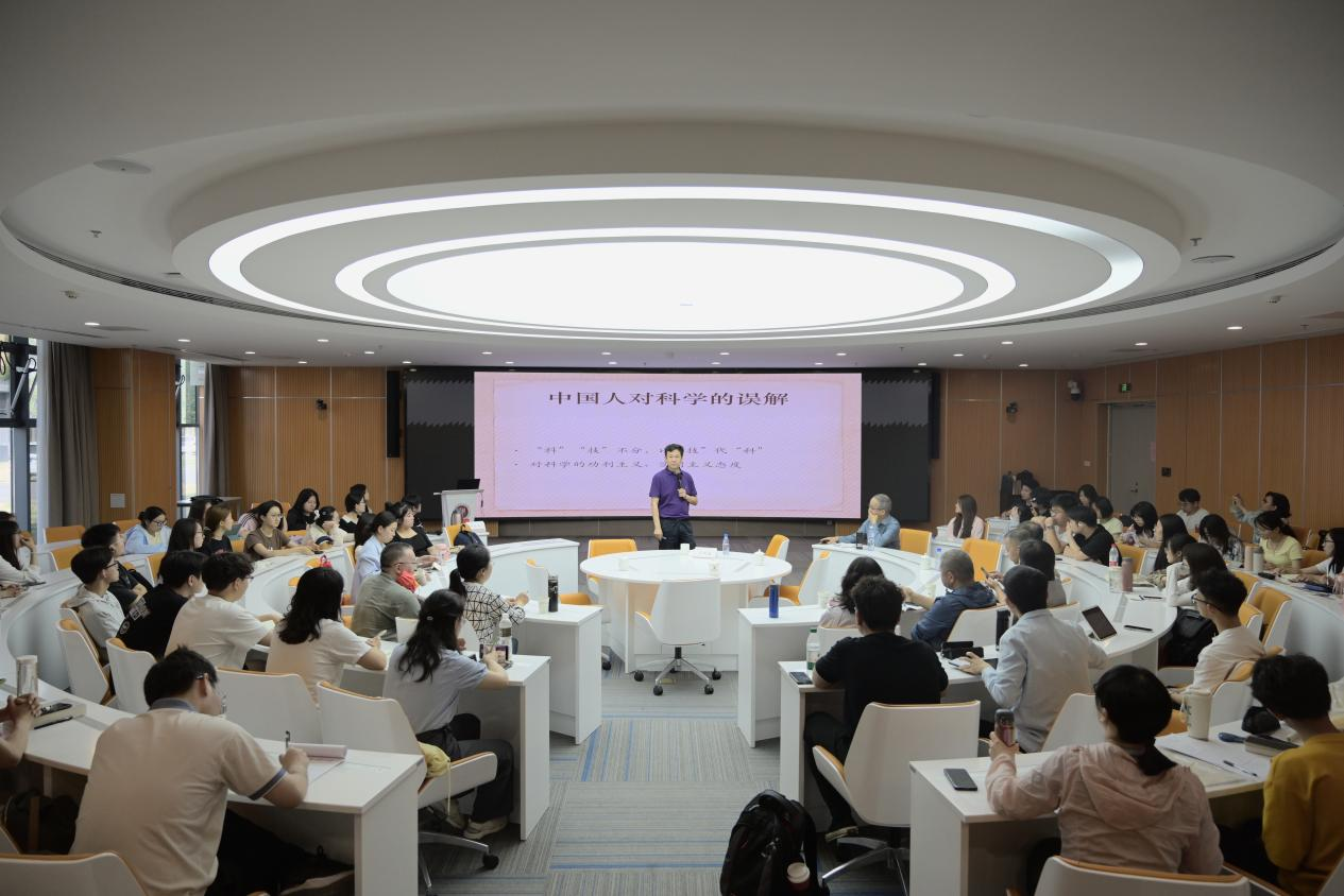 报告会上,吴国盛从科学的起源讲起,强调科学精神是追求真理的精神,要求真、讲是非,不计利害。他深入对比中西文化,阐述中国文化是血缘、亲情文化,崇尚“仁-礼”;西方文化是地缘、契约文化,追求“自由-科学”,他从哲学角度阐释科学本质上是一种人文的原因,从中西文化对比的角度解析中国古代为什么没有发展出近代科学。他鼓励青年员工,特别是师范院校的员工要深刻理解科学精神,为我国取得更多的原创性成果做出教育贡献。