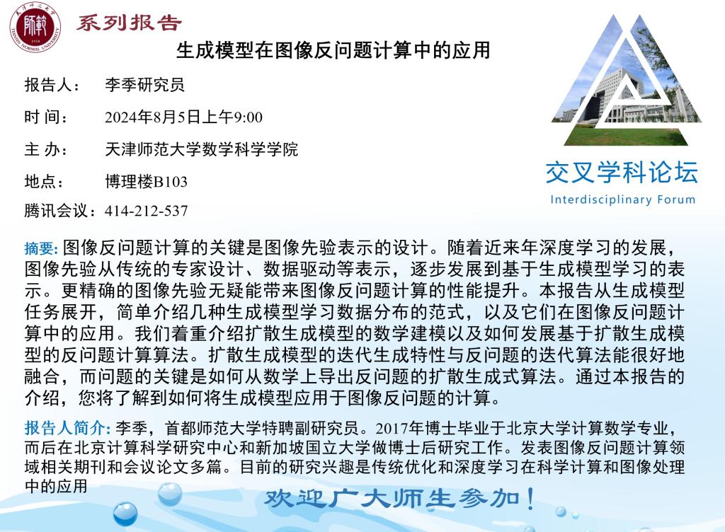 【预告】学术报告(2024-14)8月5日——生成模型在图像反问题计算中的应用