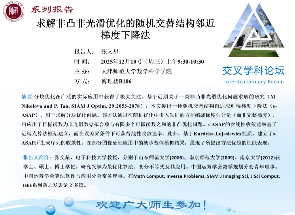 【预告】学术报告(2025-27)12月10日--求解非凸非光滑优化的随机交替结构邻近梯度下降法